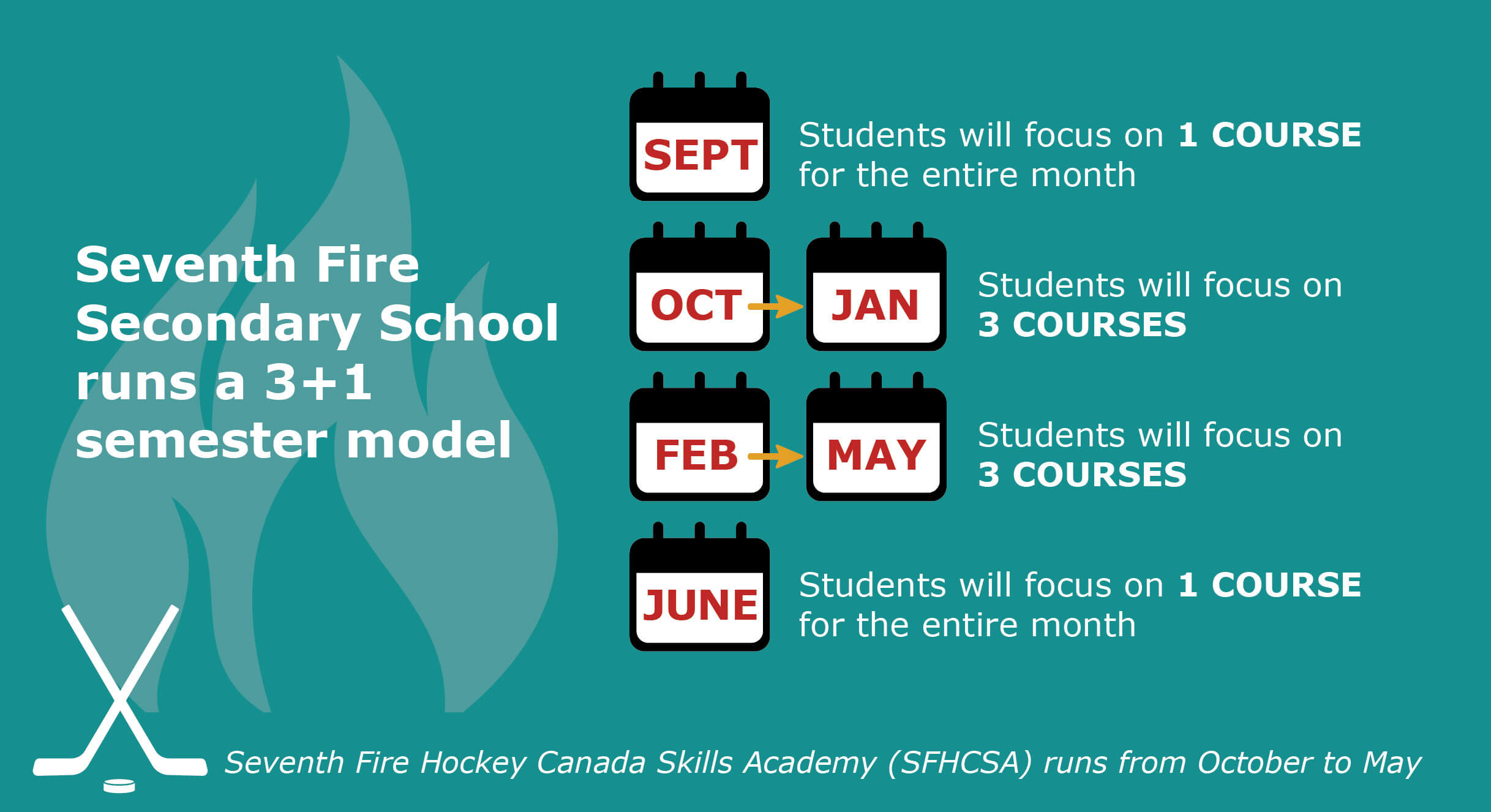 This unique educational model integrates theoretical learning with practical, hands-on experiences. Students engage in lessons and activities that foster a deeper comprehension of the subject matter. This innovative and experiential approach allows our school to offer specialized programs, such as the Seventh Fire Hockey Canada Skills Academy and the Seventh Fire Soccer Skills Academy, from October through May.
